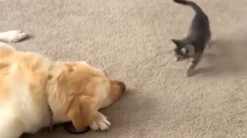 Смелый не по годам котик решил показать псу, кто здесь главный. Он подкрался к дремлющему четвероногому другу человека и провёл умилительную атаку. А пёс и не против.