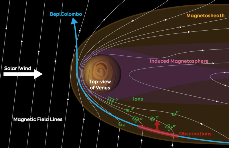 Из атмосферы Венеры происходит крупная утечка газов, в том числе углерода и кислорода, показали данные наблюдений европейского космического зонда BepiColombo. Информация была получена, когда аппарат, направляющийся к Меркурию, пролетал мимо Венеры — её атмосфера оказалась негерметичной. В дальнейшем эти данные помогут в изучении магнитной среды Венеры. Источник изображения: europlanet-society.org