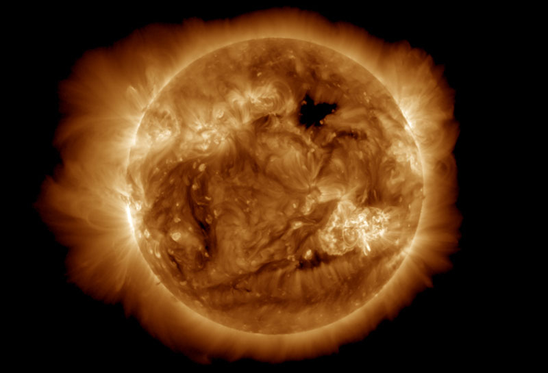 В начале недели и вчера на Солнце произошли мощнейшие за последний год вспышки, которые сопровождались выбросами коронарной массы звезды. По нашей планете одновременно ударила очередь из пяти выбросов солнечной плазмы и возникшая вчера поздно вечером рентгеновская вспышка. «Спутники Starlink под ударом, но пока держатся», — написал в сети Х Илон Маск. Также под ударом оказались энергетические сети на земле. Солнце 10 мая 2024 года через ультрафиолетовые фильтры. Источник изображения: NOAA