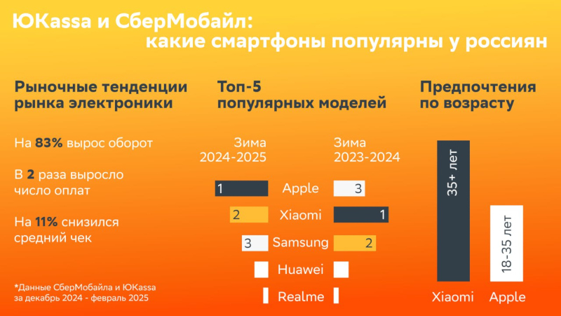 Эксперты сервиса приёма платежей «ЮKassa» (входит в «ЮMoney») и виртуального оператора мобильной связи «СберМобайл» установили, какие марки смартфонов наиболее популярны у российского потребителя. Состав пятёрки лидеров за минувший год остался прежним, но диспозиция изменилась. Источник изображения: «СберМобайл»