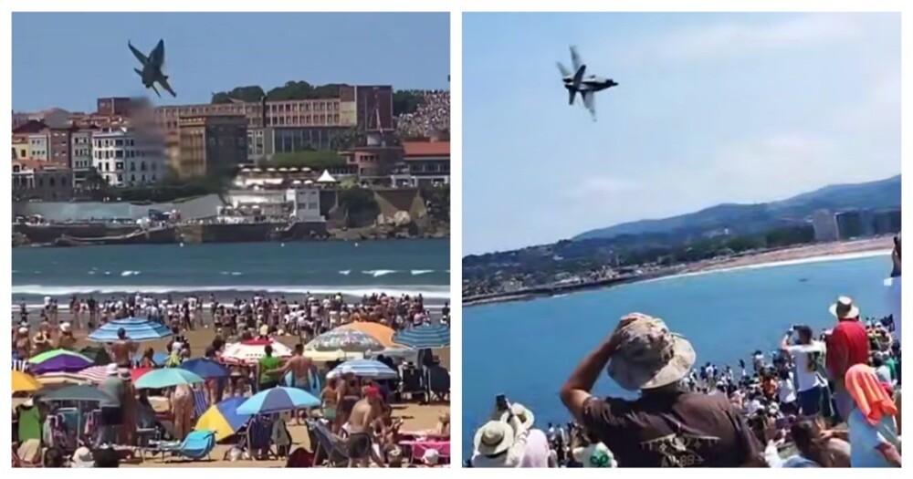 Истребитель ВВС Испании едва не рухнул на пляж, на котором находилось большое количество людей. Инцидент произошёл во время демонстрационного полета на воздушном фестивале в Хихоне.